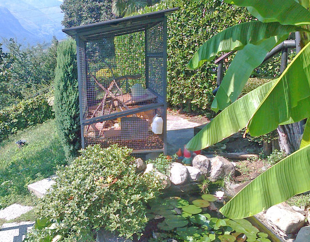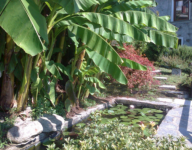 The garden is designed in a Mediterranean style and features a herb garden where our guests are welcome to help themselves. A small natural pond with goldfish also invites you to linger. Thanks to its sunny south-facing slope, the garden enjoys a mild, Riviera-like climate almost year-round, allowing a variety of flowers, exotic trees such as banana trees, palms, and grapevines to thrive.
